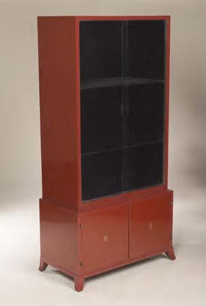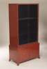 in the style of Rowley Gallery, with twin glazed doors enclosing shelves above two cupboard doors on outswept bracket feet