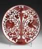 dated 1886, the design attributed to Walter Crane, painted in ruby lustre on a white ground with birds perched on scrolling foliage, also decorated verso with a band of scrolling foliage and bearing painted marks 'Maw & Co./Benthall/Jackfield 1886'