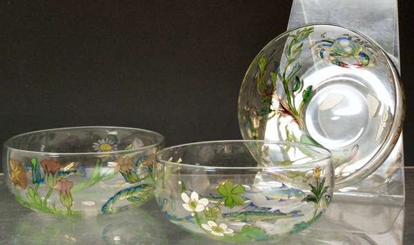 each of circular form with slightly inverted rims, decorated in coloured enamels and depicting crabs, shrimps and fish with flowering water plants and shells, each bears monogram 'H.W.' (3)