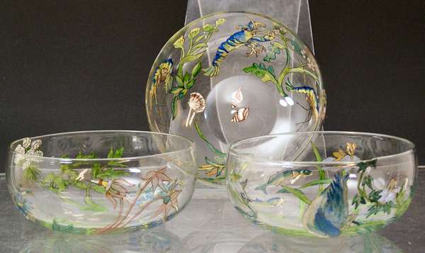 each of circular form with slightly inverted rims, decorated in coloured enamels and depicting crabs, shrimps and fish with flowering water plants and shells, each bears monogram 'H.W.' (3)