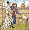 painted with a Medievalist scene depicting an old man and a lady walking in a walled garden, moulded marks verso 'Mintons China Works Stoke on Trent'