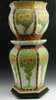 designed by Leon Solon and John Wadsworth, each of hexagonal form and printed in green, yellow, brown and blue with panels of stylised rose bushes against a cream ground, enclosed by brown and yellow borders, on wooden base, both pieces having green block printed ‘Mintons Ltd’ mark and impressed marks, and both date coded 1905 (2)