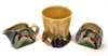 decorated in the 'Newlyn' pattern, printed marks, 6.4cm and 6cm high; also a Clarice Cliff moulded flower vase decorated in the 'My Garden' pattern, printed and painted marks, 9.5cm high (3)
