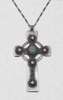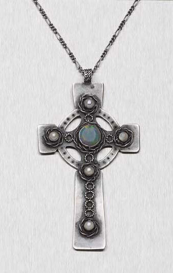 in the form of a crucifix, set with central opal and seed pearls and embellished with ropework decoration, accompanying chain