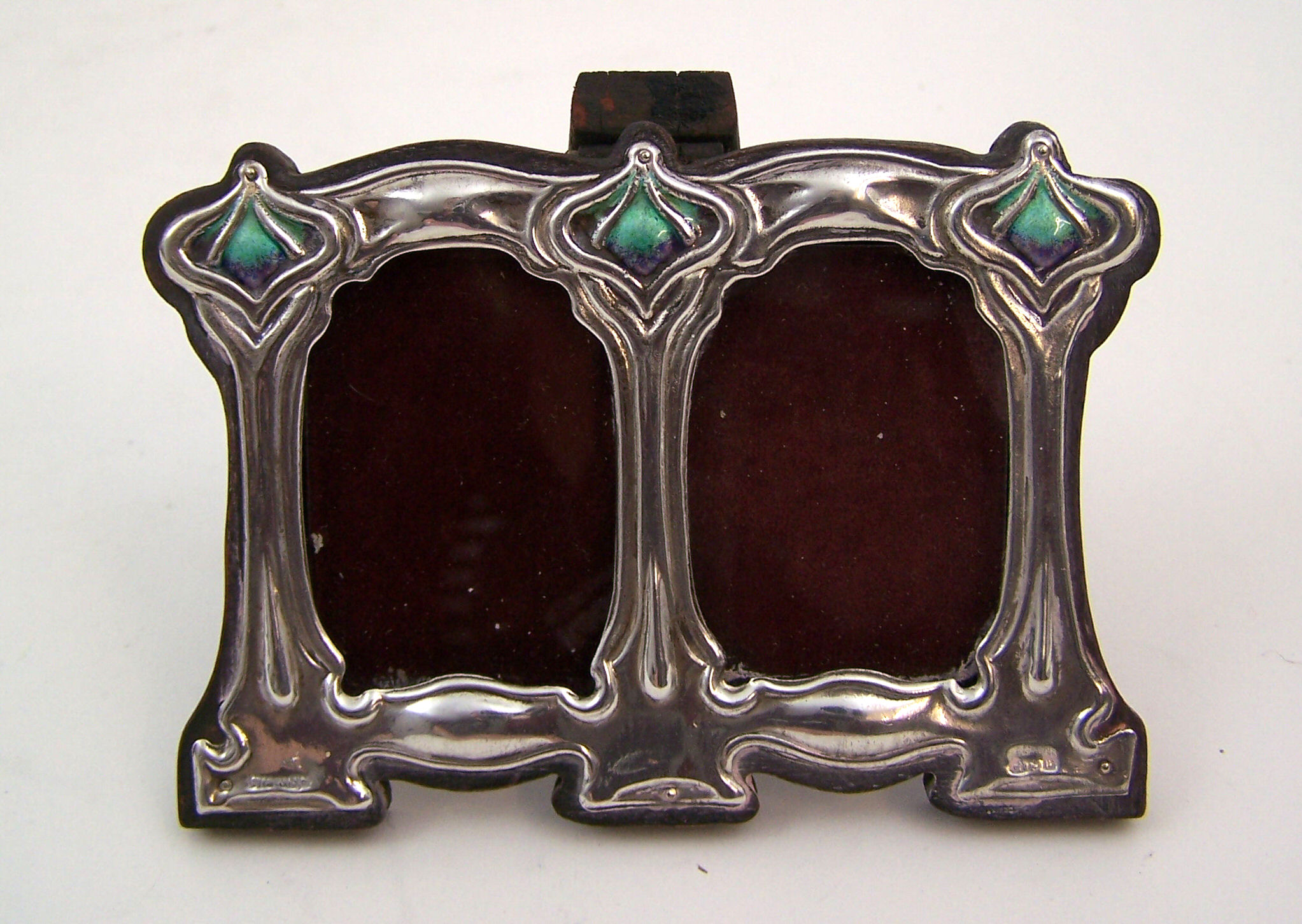 with two apertures for photographs and enclosed by a shaped frame embossed with stylised plant forms, indistinct hallmarks
