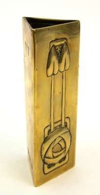 of triangular section, repousse decorated to one side with a stylised rose pendant and to the other two sides with cube frieze design, bears monogram 'MG'