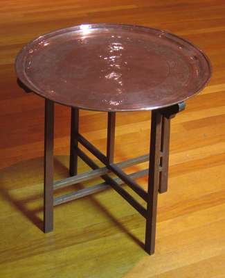 A Keswick School of Industrial Arts copper tray on folding stand,
