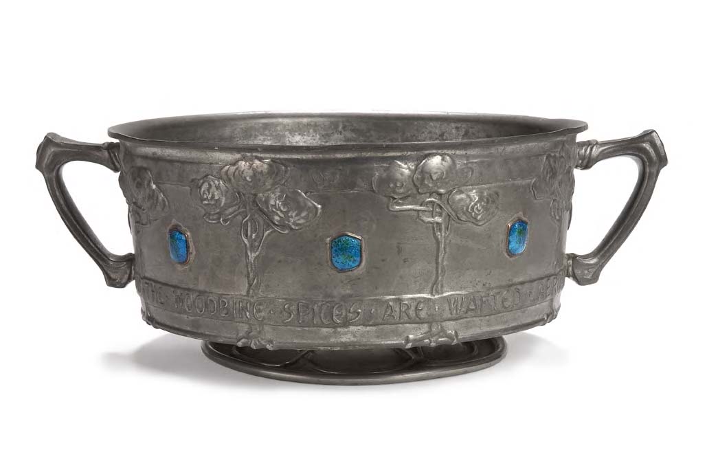 designed by David Veasey for Liberty & Co., of circular form, cast with a frieze of flowering trees and enamel panels and bearing the inscription '...and the woodbine spices are wafted abroad, and the musk of the roses are blown', stamped marks 'Tudric 011'