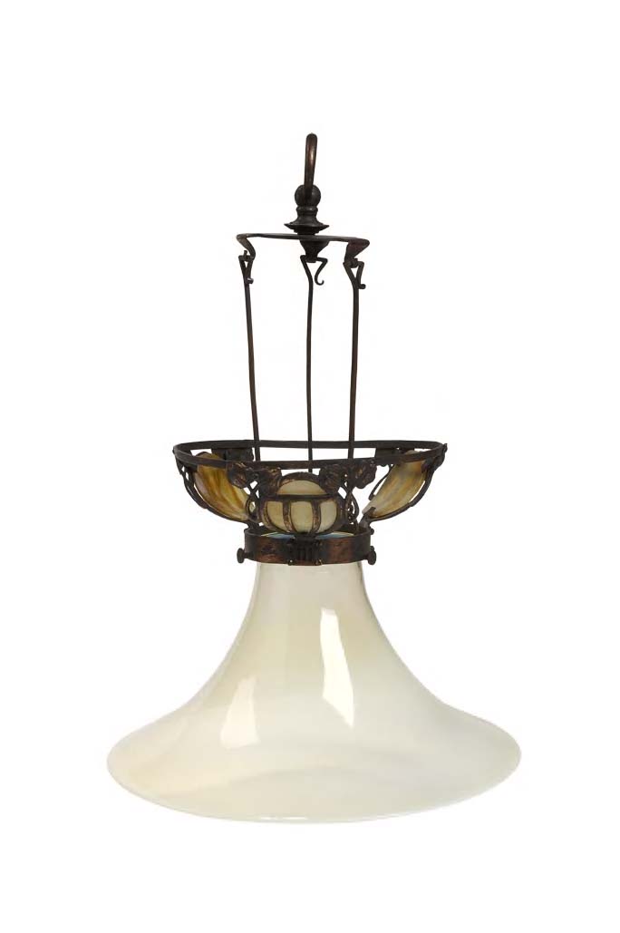 in the manner of Benson, the flaring vaseline glass shade with dished support, pierced and cast with foliate motifs and set with three glass panels, with three hanging rods, hanging chain and ceiling rose