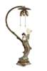 cast as the figure of a Japanese girl, with flowing robes, holding fans in her hands, raised on a traditional stand and surmounted by a curved support, cast as a naturalistic branch and terminating in a light fitting, cast mark 'Harders'