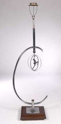 the square column suspending a rotating cut-out pendant of a dancing girl, and supported by a curved upright raised on a square base with polished wood plinth