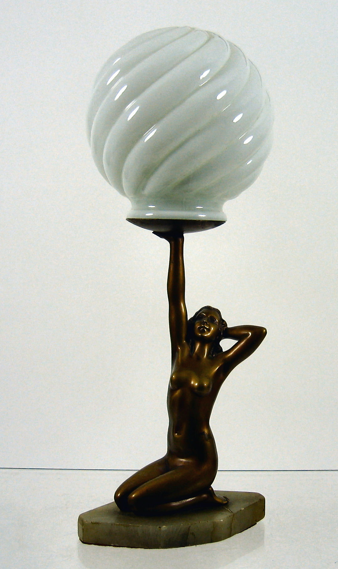 cast in the form of a naked girl, on shaped onyx base (cracked) and holding aloft a spherical glass shade