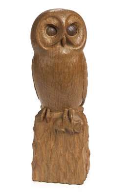 Carved oak figure, modelled as a standing owl holding a mouse in its talon, on a rockwork base