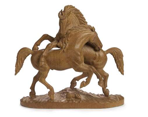 Carved oak figure, modelled as two rearing stallions, carved mouse signature