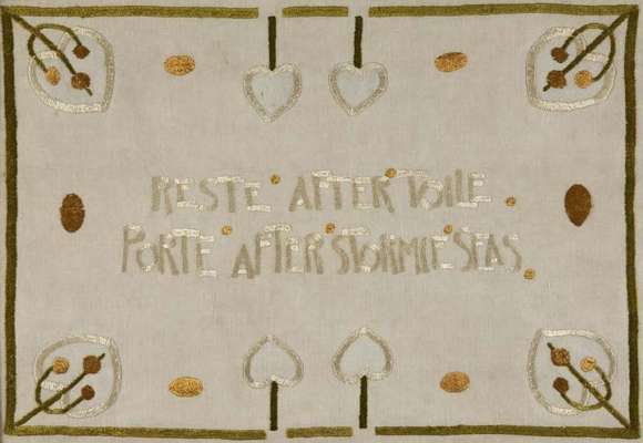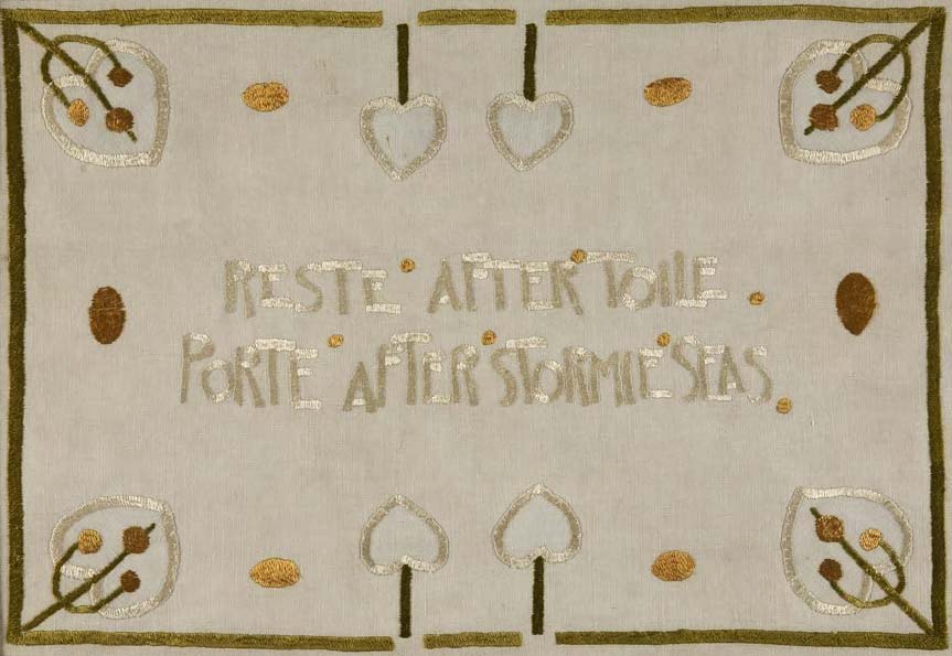 worked in coloured silks on a linen ground and bearing the inscription 'Reste after toile, Porte after stormy seas, within stylised foliate border