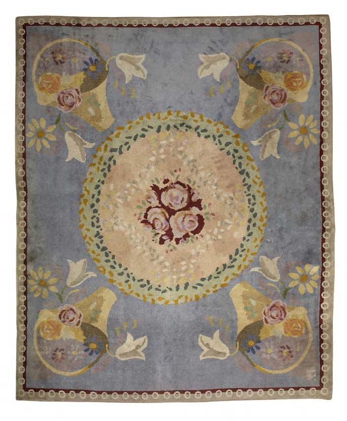 probably woven by Wilton Royal, circa 1935, with baskets of flowers to the angles and centred by flowers within rings of petals, the whole bounded by characteristic border