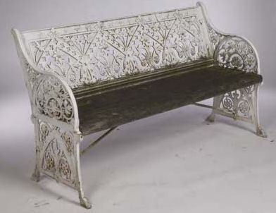in the style of Christopher Dresser, overpainted in white, the back cast with pierced strapwork and flowering foliage, the arms filled with similar castings enclosing a wooden slatted seat on outswept legs linked by corresponding foliate panels