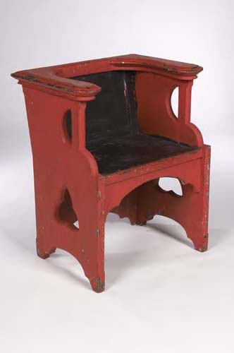 with curved and moulded arms and straight planked back and seat, the sides pierced with trefoil motifs, the seat with arched apron, overpainted, originally with cushioned pads, now lacking