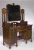 comprising a three door wardrobe, the projecting cornice above central section with two panelled bowed doors inlaid with stylised plant forms above a single bowed drawer and two short over two long drawers, flanked by mirrored doors with decorative fringes and raised on square supports 205cm wide, 215cm high, 68cm deep; also a washstand, 122cm wide; a dressing table, 122cm wide; and a pair of single bed ends 91cm wide, en suite (5)