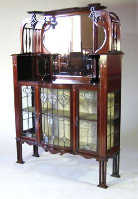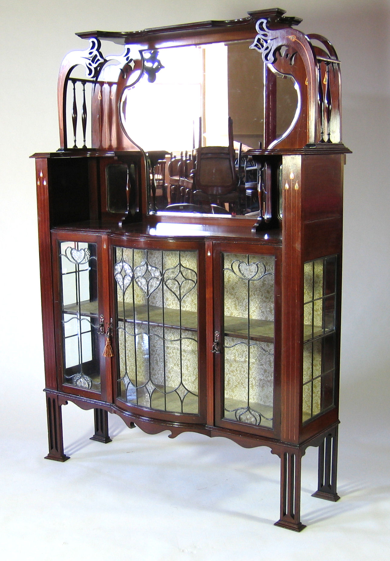 the projecting cornice above shaped mirrored back, enclosed by curved and inlaid uprights with spindle filled sides, the shaped top above centrals stained and leaded glass door, flanked by corresponding panels on rectangular section legs