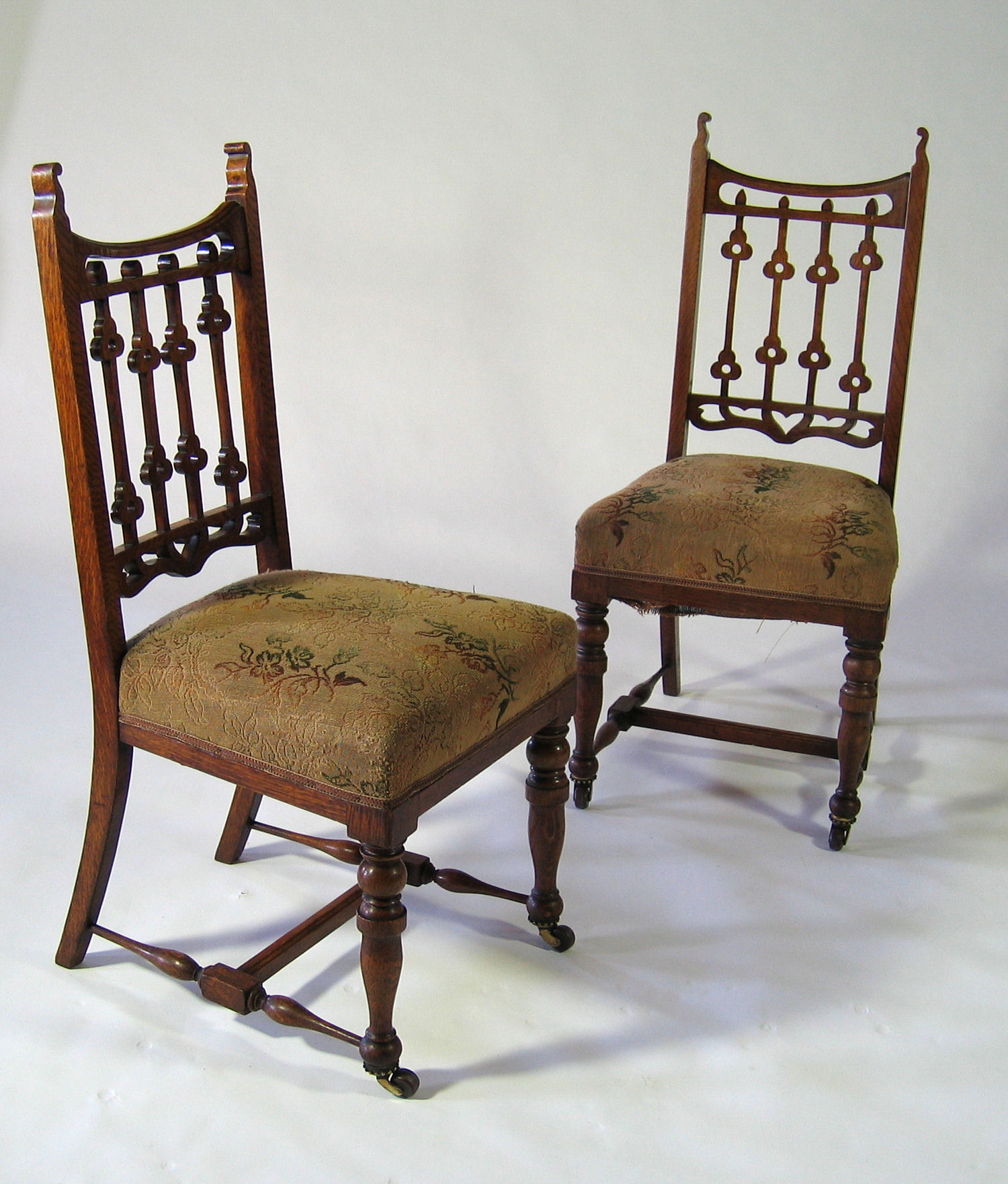 each with spindle filled back, the spindles with stylised flowerheads, raised above stuffover seat on turned legs linked by stretchers (6)