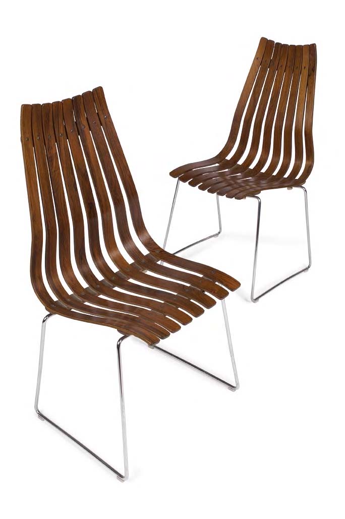 designed 1957, each with curved and slatted backs and seats raised on tubular chrome supports, bears 'Made in Norway/Hove Møbler/Stordal' (6)