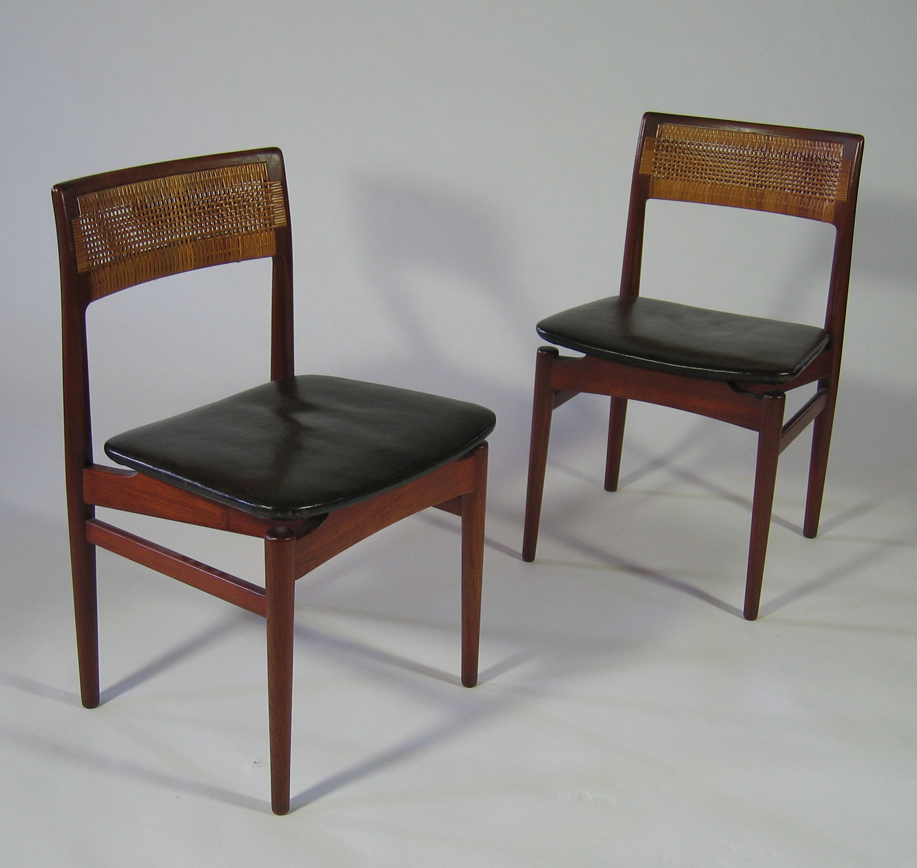 comprising a table, the rectangular top above wishbone supports, 170cm long, 70cm high, 85cm deep; and a set of four dining chairs, the double caned backs above leather-upholstered seats on turned and tapering legs, stamped marks 'Worts Mobler, Danmark' (5)