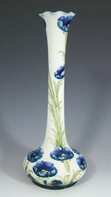 the flatted ovoid body with tall cylindrical neck and frilled rim, decorated with blue poppies on a white ground, printed marks, signed in green (chips to rim)