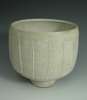 of cylindrical footed form with ribbed band, white glaze, two impressed marks