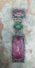 of pierced rectangular outline, the central collet set heart cut green cabochon, flanked above and below by similarly set oval cut vari-coloured tourmaline cabochons, within rose cut marcasite borders