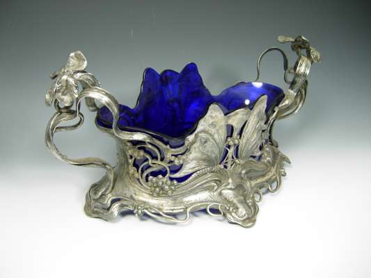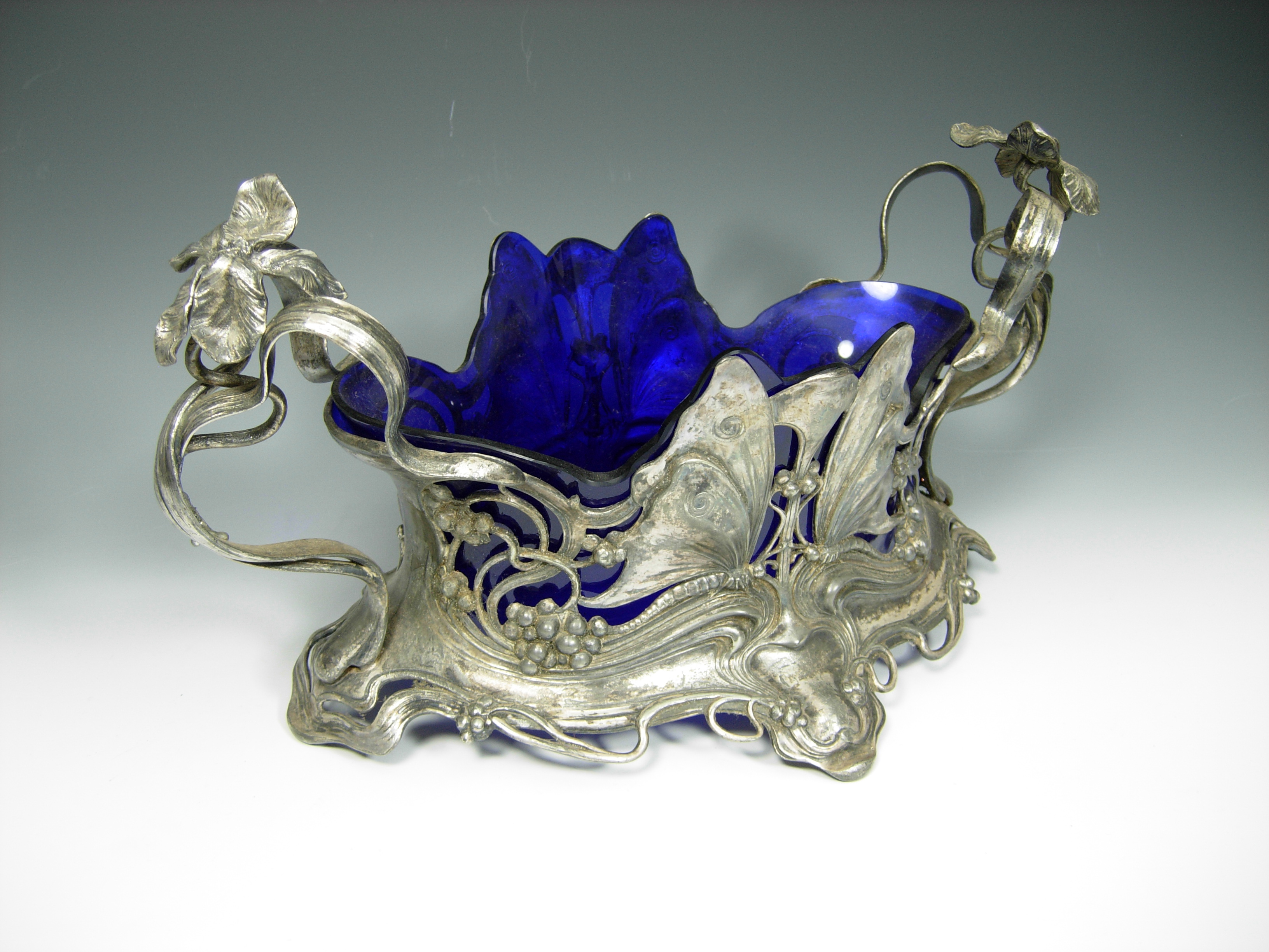 with oval blue glass liner, the twin-handled frame elaborately cast with whiplash foliage and with flowers centred by opposed butterflies, stamped marks