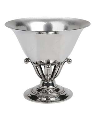 the circular bowl with everted rim and hammered finish raised on stylised leaf and berry supports on a spreading circular base, stamped marks