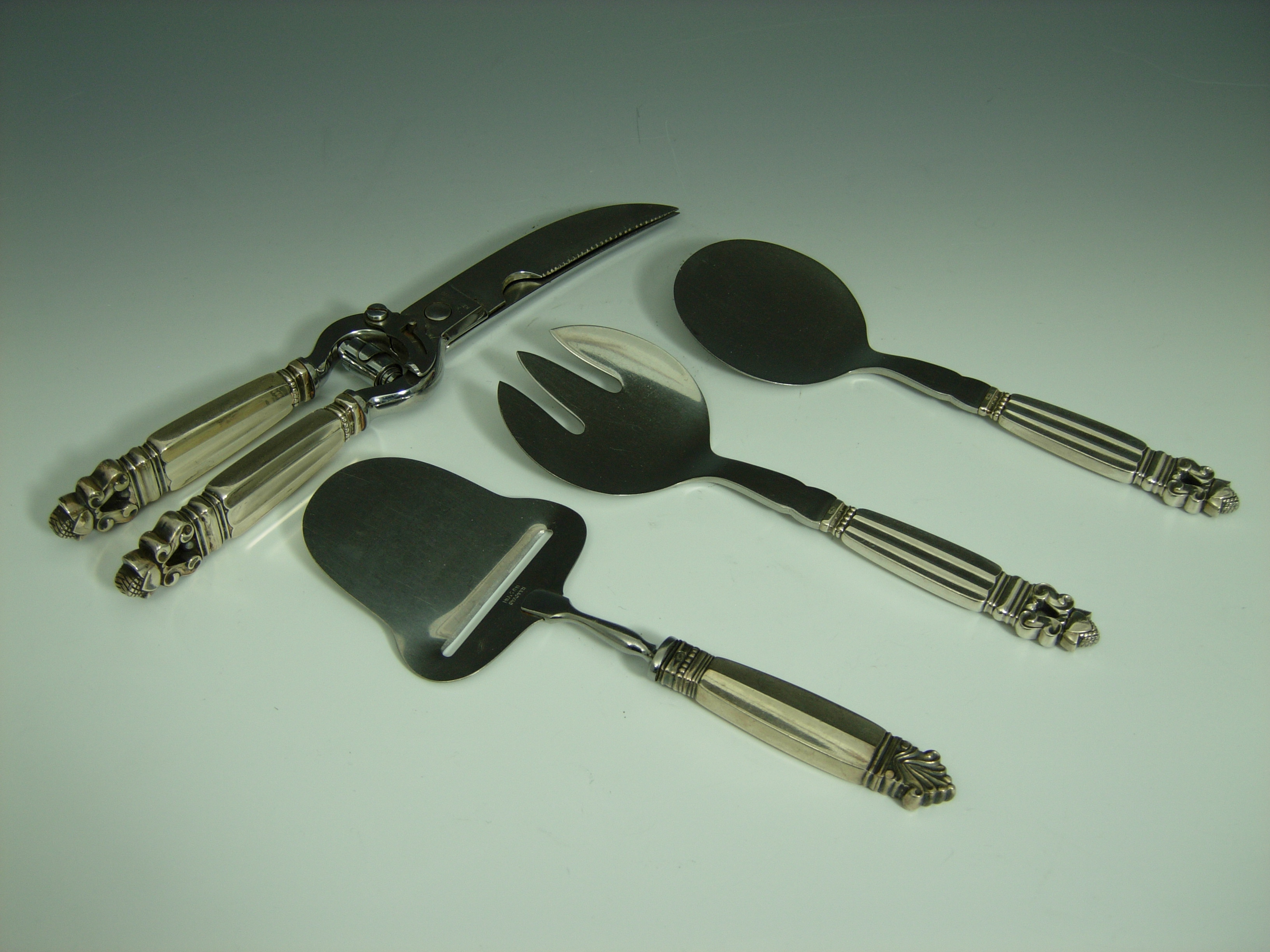 designed by Johan Rohde, comprising a pair of bone cutters, a pair of salad servers and a cheese slice of similar design, each in silver handles and stainless steel, stamped factory marks (4)
