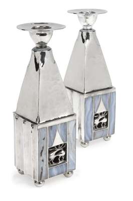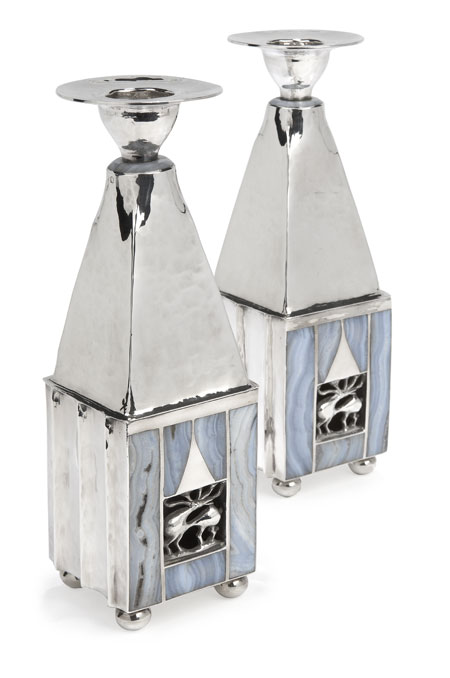 of square tapering form with blue agate collar bellow the circular sconce, on square bases with inlaid blue agate panels around a stag motif to two sides the others with concave flutes, all with a hand beaten finish (2)