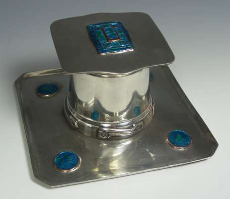 inset with turquoise enamels, the shapes and hinged lid enclosing a glass well, the cylindrical body with applied Celtic motifs raised on a rectangular base with canted angles, stamped marks, no. 0141