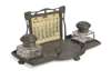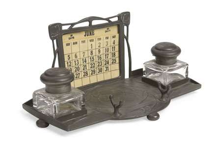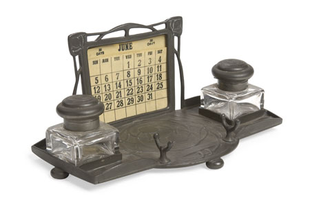the superstructure with ivorine calendar cards enclosed within foliate frame, the base with shaped rectangular tray, cast with stylised plant forms, fitted with two glass and pewter inkwells and a pen holder, the whole raised on flattened bun feet