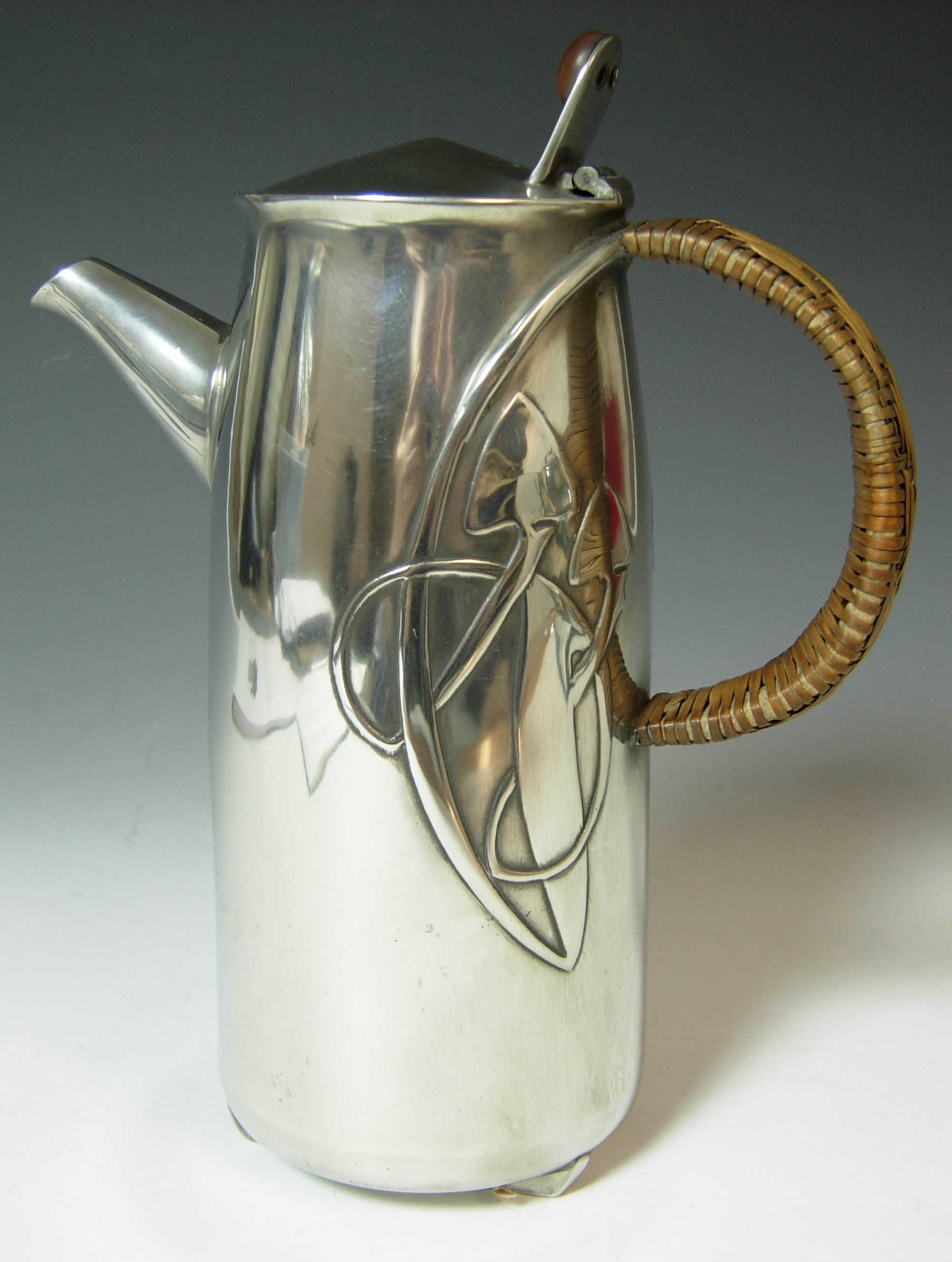 of swollen cylindrical form, the hinged lid with insulated thumbpiece above a wicker-covered handle and a spout, the body decorated with stylised plant forms, stamped marks, no. 0231