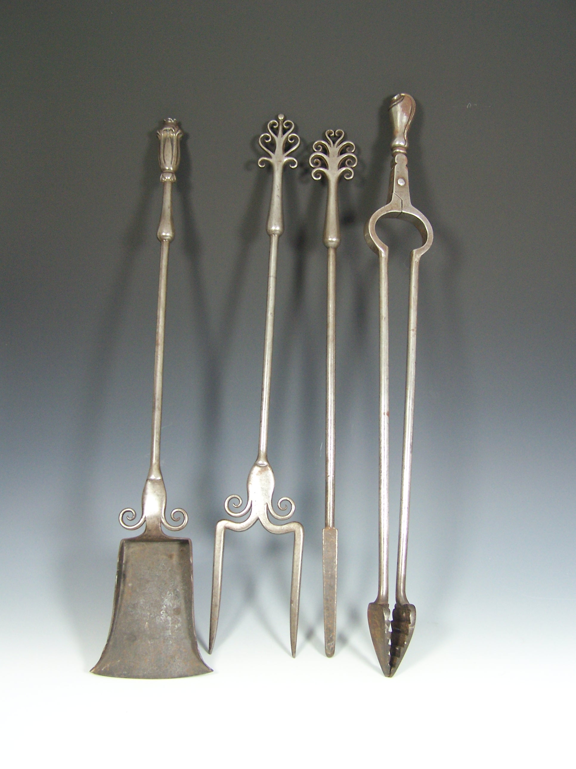 A COMPOSITE SET OF FOUR SCOTTISH ARTS & CRAFTS STEEL FIREIRONS