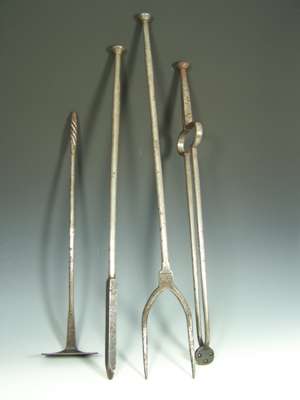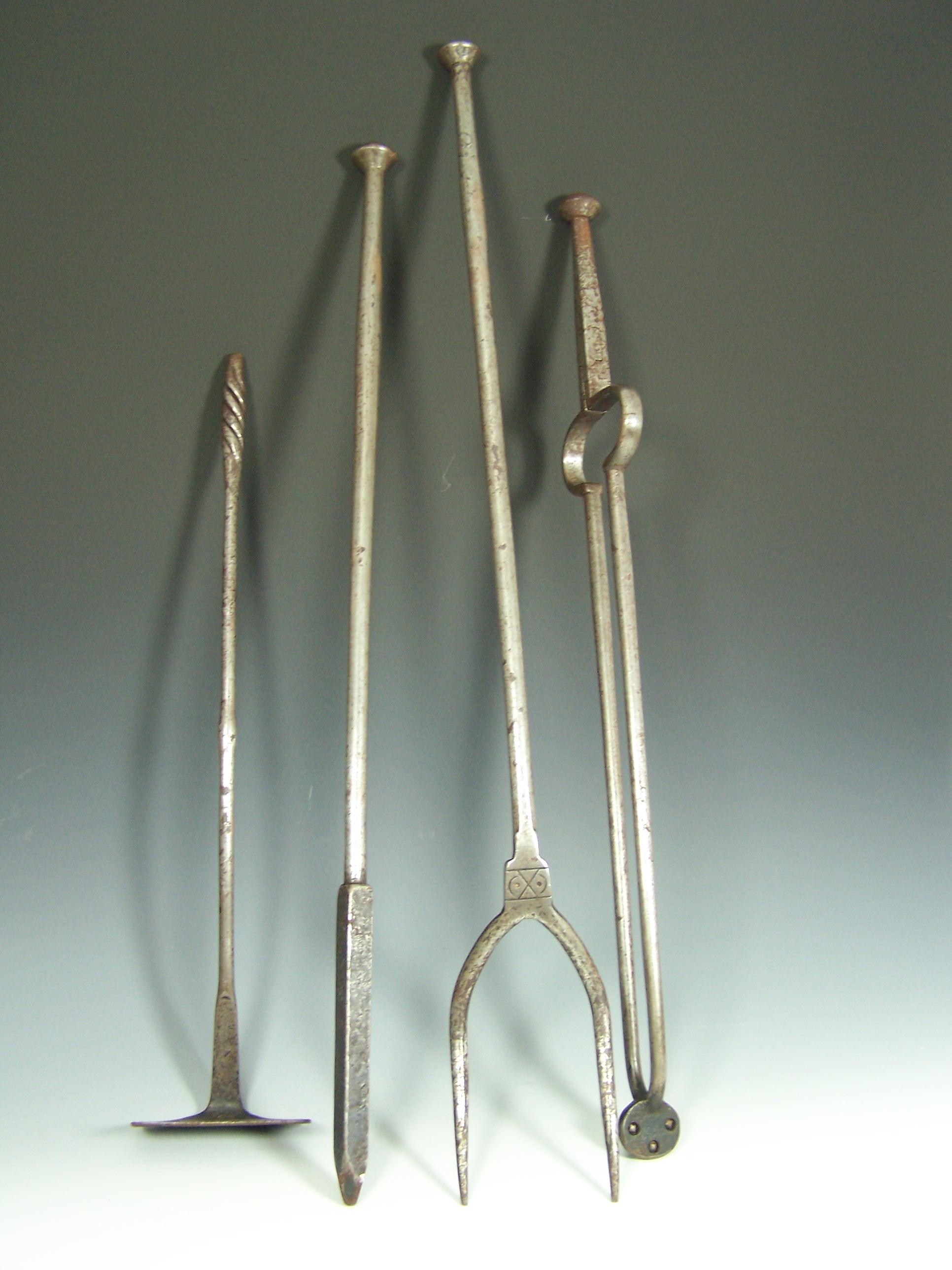 each with boldly turned knop terminals, comprising a log fork, a poker and a pair of coal nippers, approx 84cm long; also an associated poker (4)