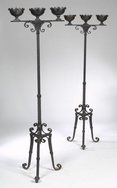 A PAIR OF WROUGHT IRON STANDING CANDLEBRA