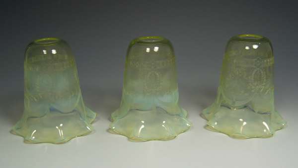 each of bell form with frilled rims, etched with laurel and ribbon swags (3)