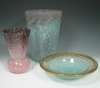 the pale blue mottled body with swirling pale pink inclusions to the rim, 25cm high; a Monart circular glass bowl, shape IG VI, the pale blue body with aventurine inclusions to the rim, paper label, 24cm diameter; and a Monart thistle-shaped vase, the mottled pink body with amethyst and aventurine inclusions to the rim, 18cm high (3)