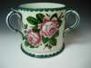 of cylindrical form, with three applied handles, decorated with cabbage roses, printed retailers mark (damage to one handle)