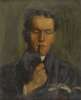 painted with a band of fruiting branches and bearing inscription 'Alan Davey Watt', painted inscription to base 'A Present from Aunty' 8.5cm high; Watt, Alan Davey Our baby. Glasgow: privately published, [no date], 8vo, illustrated by Elizabeth Mary Watt, paper wrappers, good condition; twenty unused new born arrival cards, illustrated by the artist and a certificate relating to ALFRED McEWAN WATT'S employment with the Post Office; an oil painting, portrait of ALFRED McEWAN WATT, by Elizabeth Mary Watt, oil on canvas, 52cm x 42cm