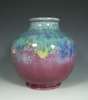 covered in streaked and overlapping blue, turquoise and pink glazes on a purple ground, impressed mark