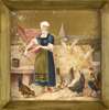 depicting a maiden feeding chickens in a courtyard, bears initials 'HSM', framed