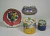 decorated by Elizabeth Amour, the ovoid body painted with a camellias, painted and printed marks, 13cm across; a Bough dessert bowl, painted by Richard Amour with a panel of fruits, printed and painted marks, 16cm across; a preserve jar and cover, painted with Honesty by Richard Amour, printed and painted marks, 10.5cm high; and another Bough preserve jar and cover (4)