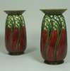 of swollen ovoid form with broad everted rims, each decorated in tube-line with stylised elongated plant forms on a red ground, printed marks no (2)