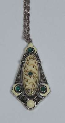 with simulated ivory pierced panel set with chrysoprase, marcasite and white enamel, signed with monogram 'TF' and stamped 935