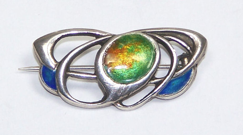 stamped CYMRIC STERLING, of scroll design, enamelled in shades of green and blue